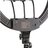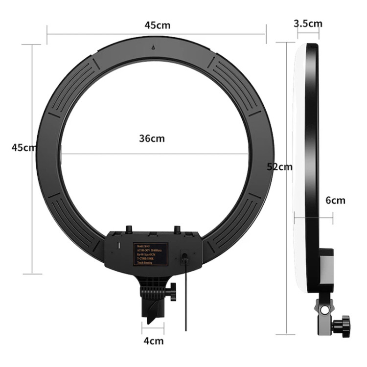 ابعاد ۴۵x۴۵x۵۲ میلیمتر وزن ۱۰۰۰ گرم ویژگی ها -۱۵طیف رنگی -دارای دو دیمر -کنترل از راه دور -دارای سه هولدر.ریموت و کابل برق و سه پایه بلند -دارای یک درگاهUSB(برای شارژ همزمان موبایل) -چرخش۳۶۰درجه -بهترین گزینه برای عکاسی پرتره،تبلیغات و مدلینگ -xمدل روی رینگ لایتM-۴۵ -xمدل روی جعبهMJ۱۸(مدل کلی پک) زاویه نوردهی ۳۶۰ درجه دمای رنگ ۲۷۰۰-۵۵۰۰K